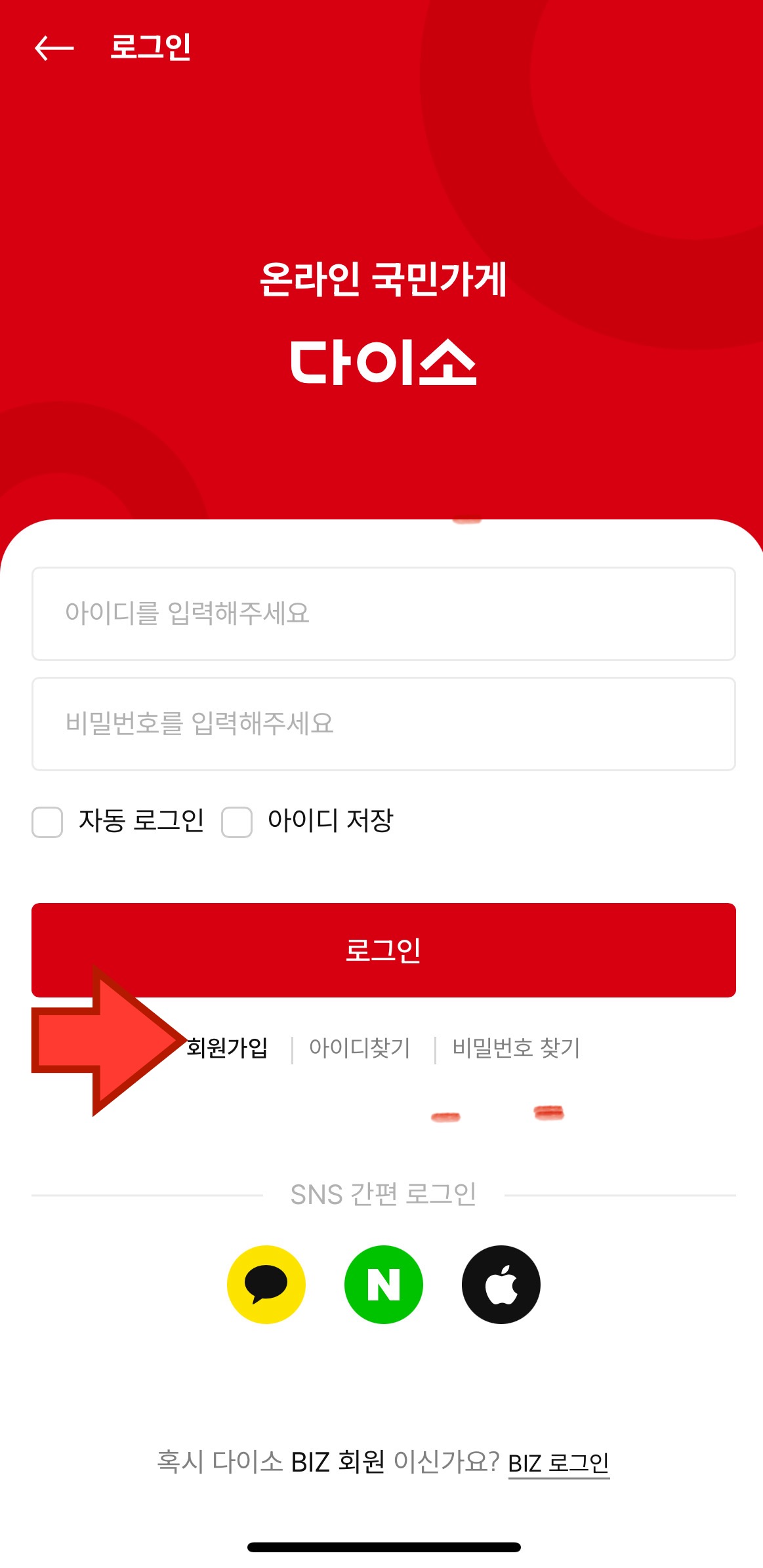 화살표를 보시면 다이소몰 회원가입 버튼이 있습니다.