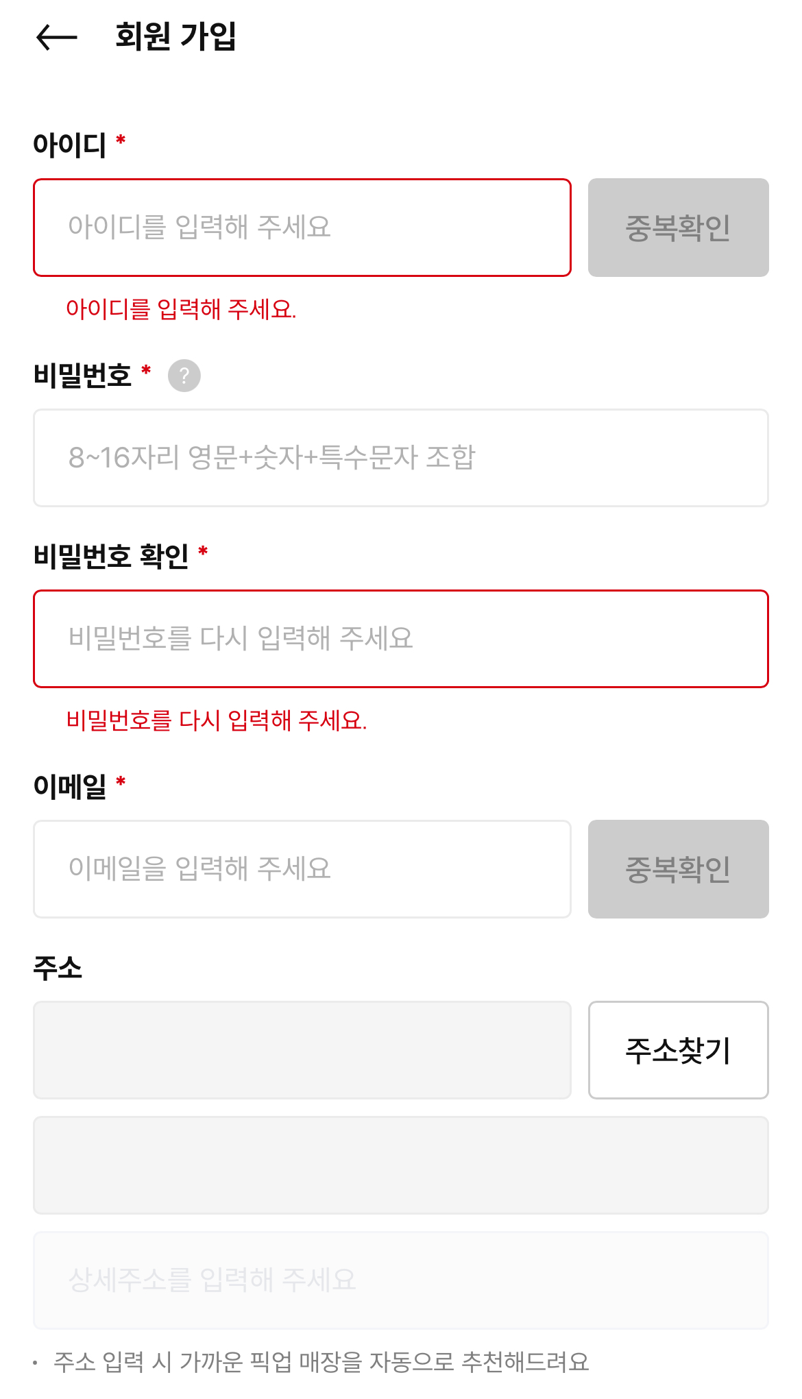 중복확인 버튼을 누르고 중복 사용된 아이디, 이메일은 사용이 불가합니다.