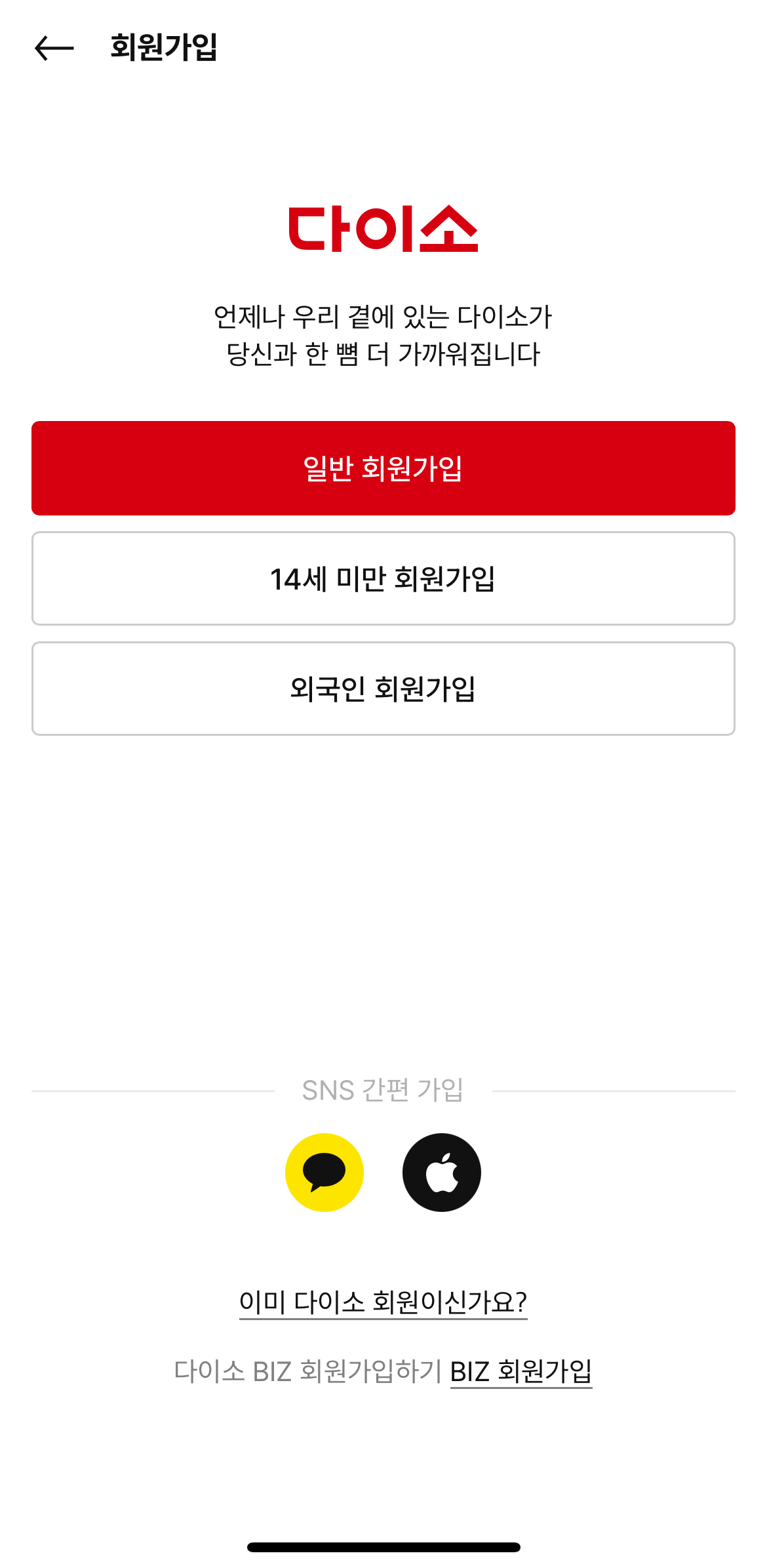 이전에 가입하셨던 다이소샵은 다이소몰과 다른 애플리케이션이어서 다시 회원가입을 해야 합니다.