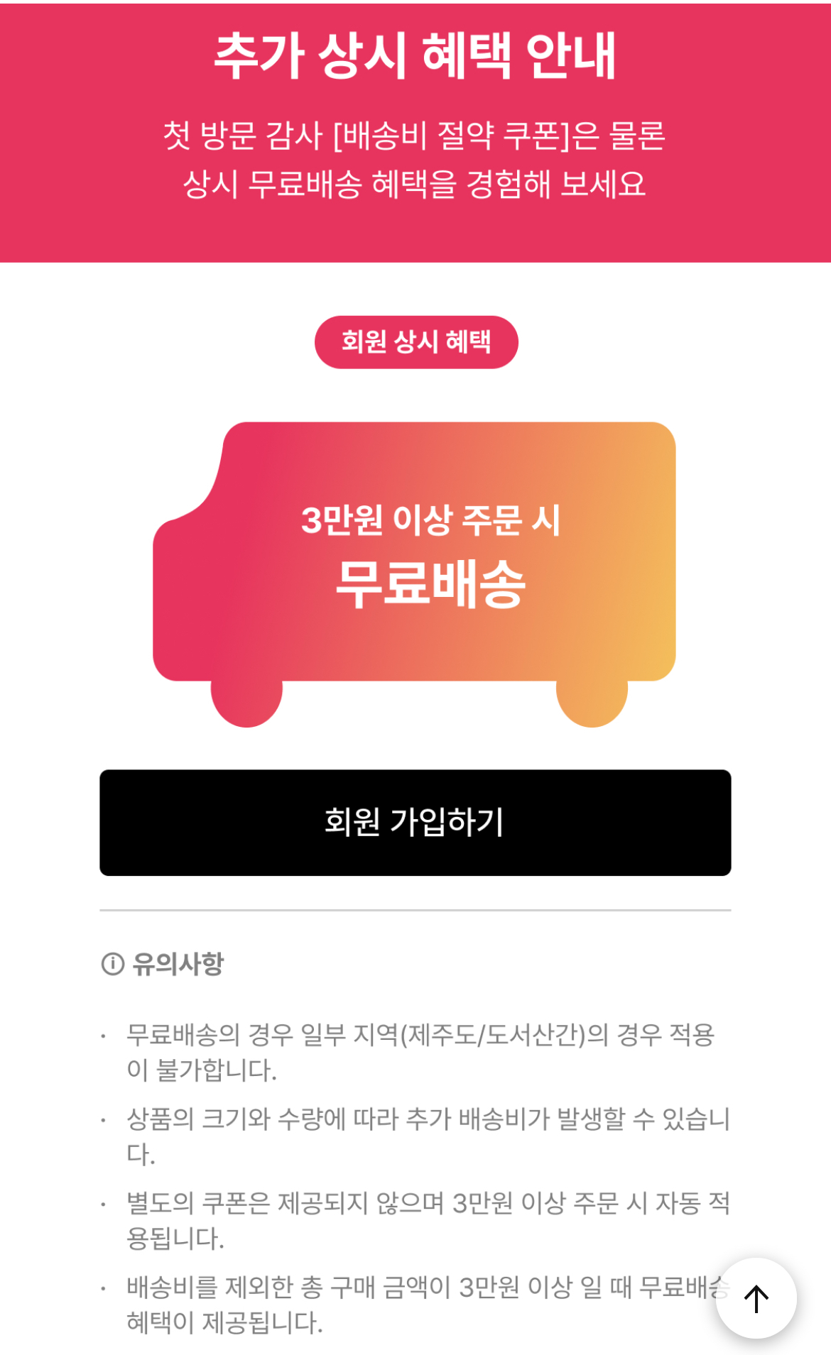 다이소몰 회원가입한 회원 혜택으로는 3만 원 이상 구매 시 상시 무료배송 혜택을 드리고 있습니다. 별도의 쿠폰 없이 3만 원 이상 구매하시면 자동으로 무료배송이 적용됩니다.