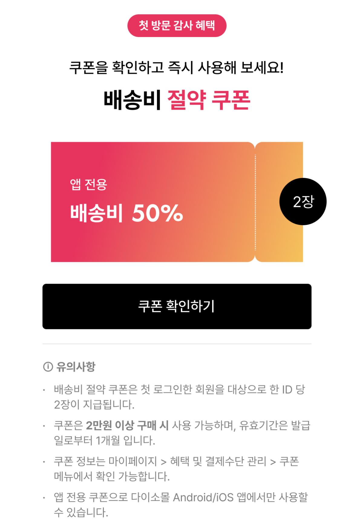 다이소몰 배송비 절약 쿠폰 2장을 제공하고 있습니다.