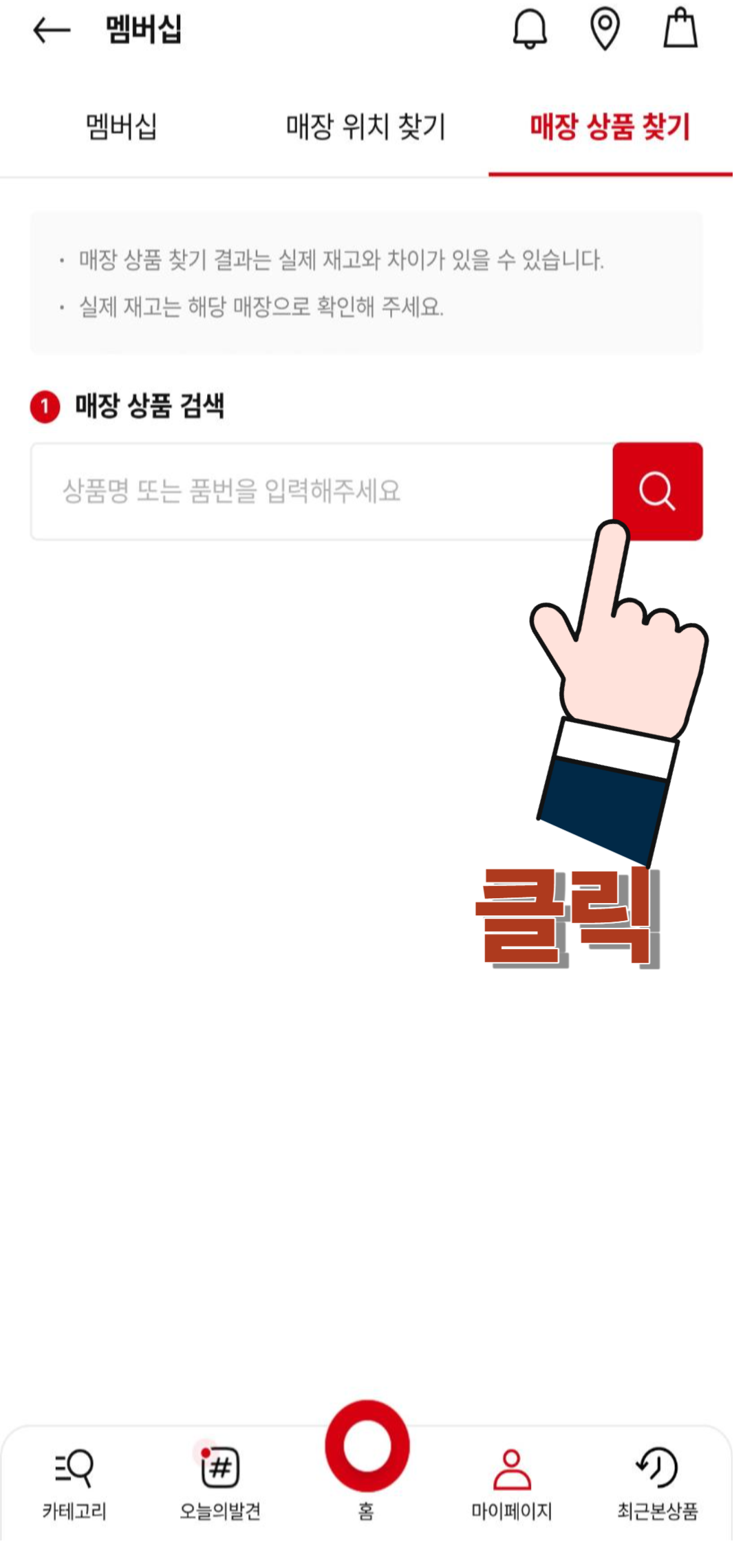 이화면에서 매장 상품 찾기 버튼을 누르시면 매장을 선택할 수 있는 화면으로 넘어갑니다.
