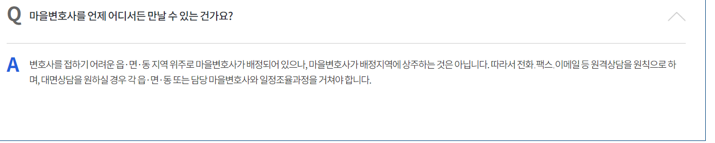 마을 변호사는 접하기 어려운 지역에 거주하는 지역 주민들이 변호사와 쉽게 상담할 수 있게 도와주는 제도입니다.