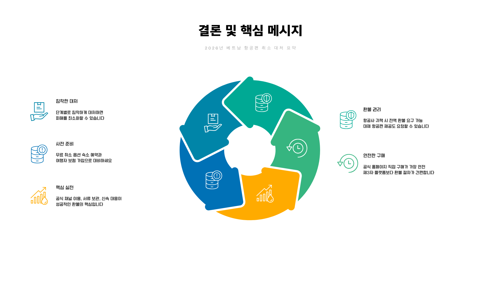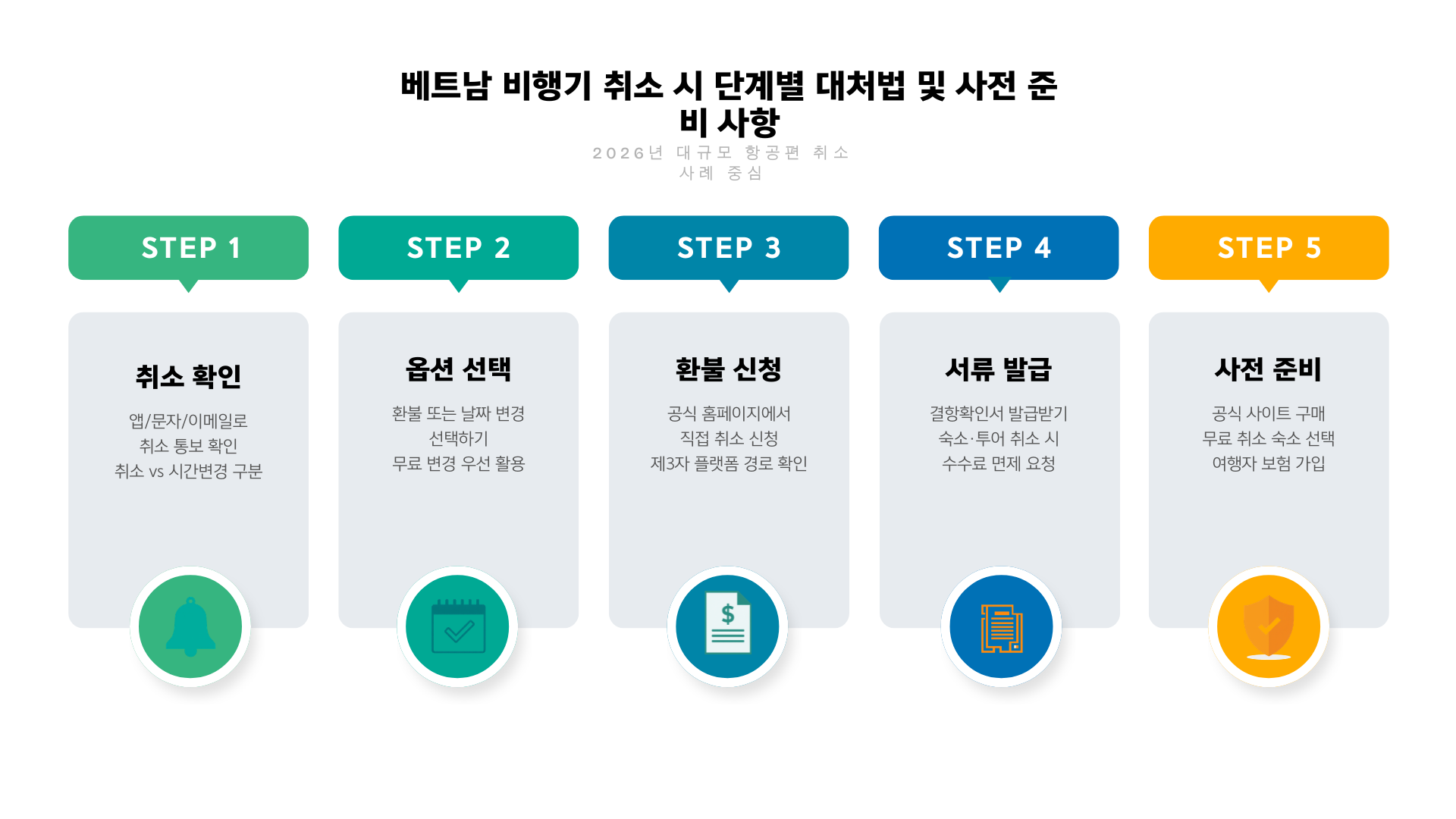 당황하지 말고 취소 유형 파악, 환불 또는 날짜 변경, 결항확인서 발급 순서로