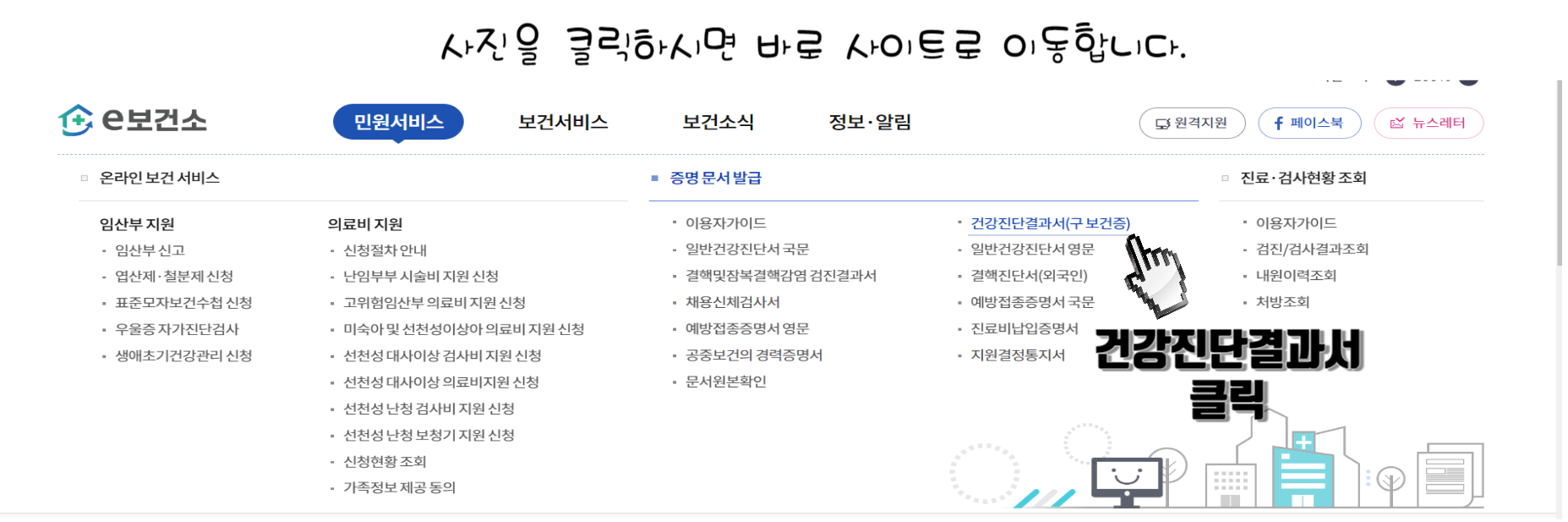 1) e보건소 홈페이지에 들어가서 민원서비스버튼을 올리시면 여러 버튼 중에서 건강진단결과서( 구 보건증)를 클릭하시면 됩니다.