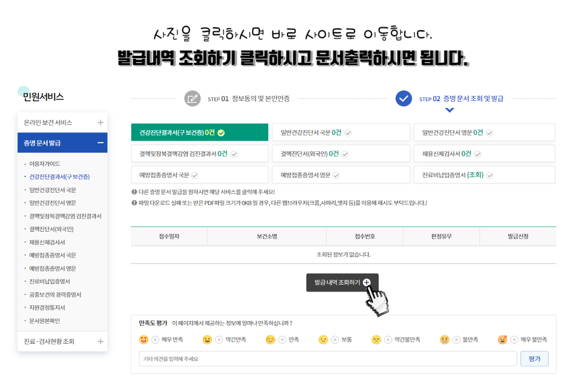 4) 발급내역 조회하기 클릭 후 문서를 선택하시고 보건증을 발급하시면 됩니다.