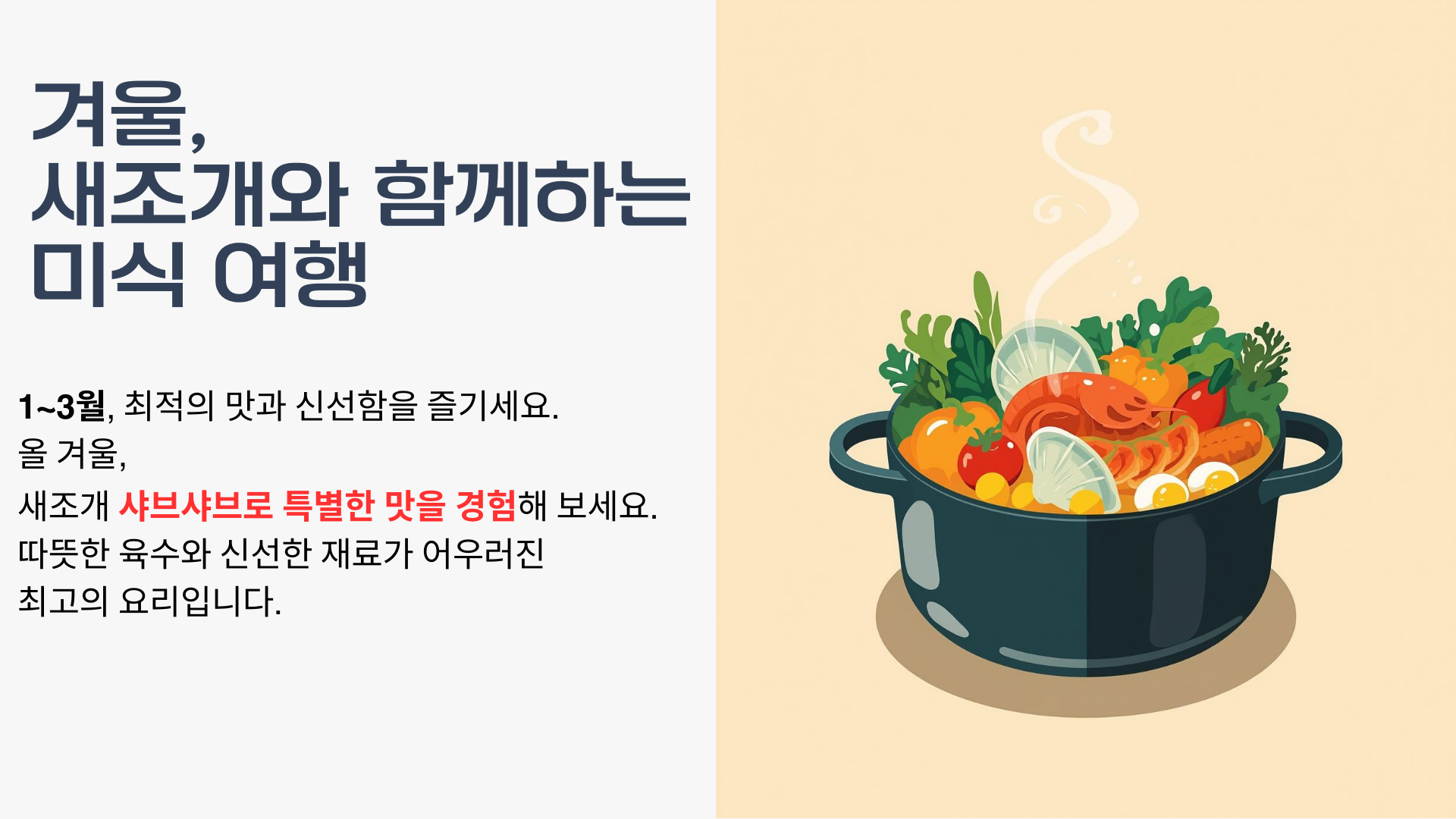 올 겨울, 따뜻한 육수에 새조개 샤브샤브 한 번 즐겨보세요!
