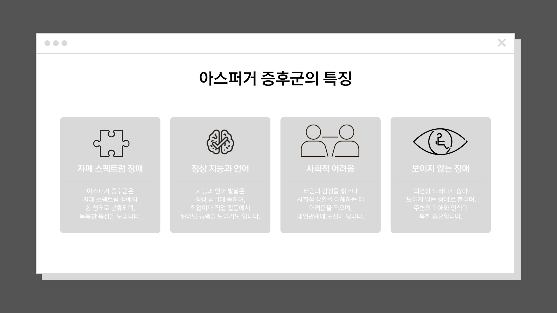 그래서 아스퍼거 증후군은 보이지 않는 장애라고도 불려요.