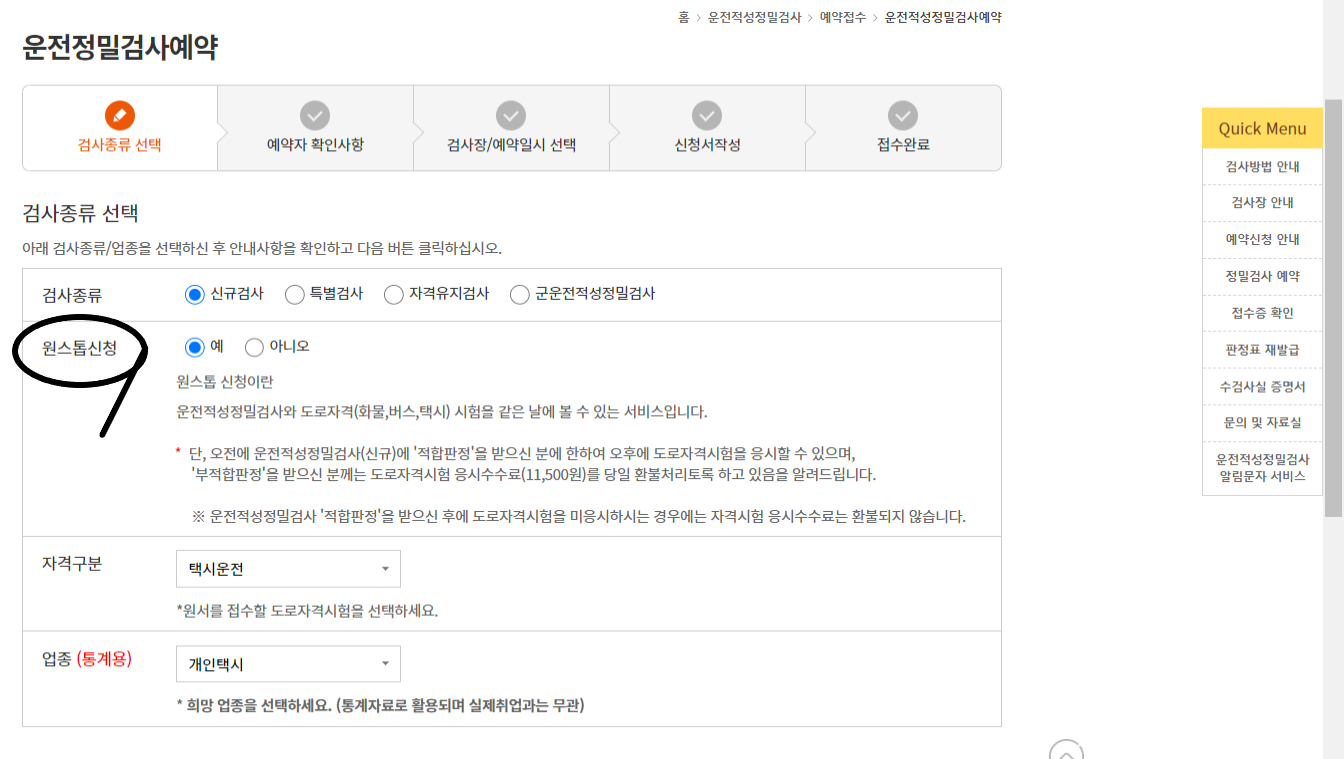 원스톱예약: 신규검사와 도로 자격(화물, 버스, 택시) 시험을 당일에 모두 진행하실 경우 “원스톱”으로 신청하시면 됩니다.