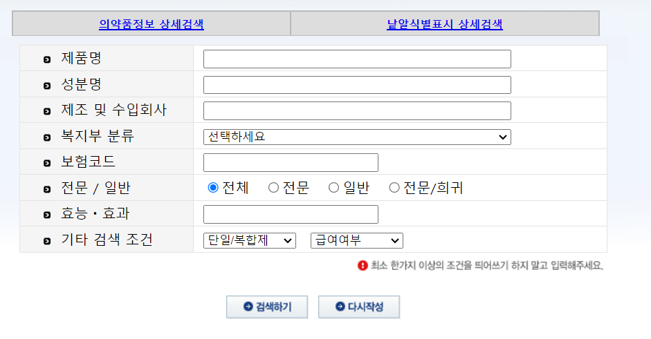 의약품정보 상세검색에서는 제품명만 입력해도 결과가 나옵니다. 필요한 정보가 있으시면 검색해 보셔도 됩니다.